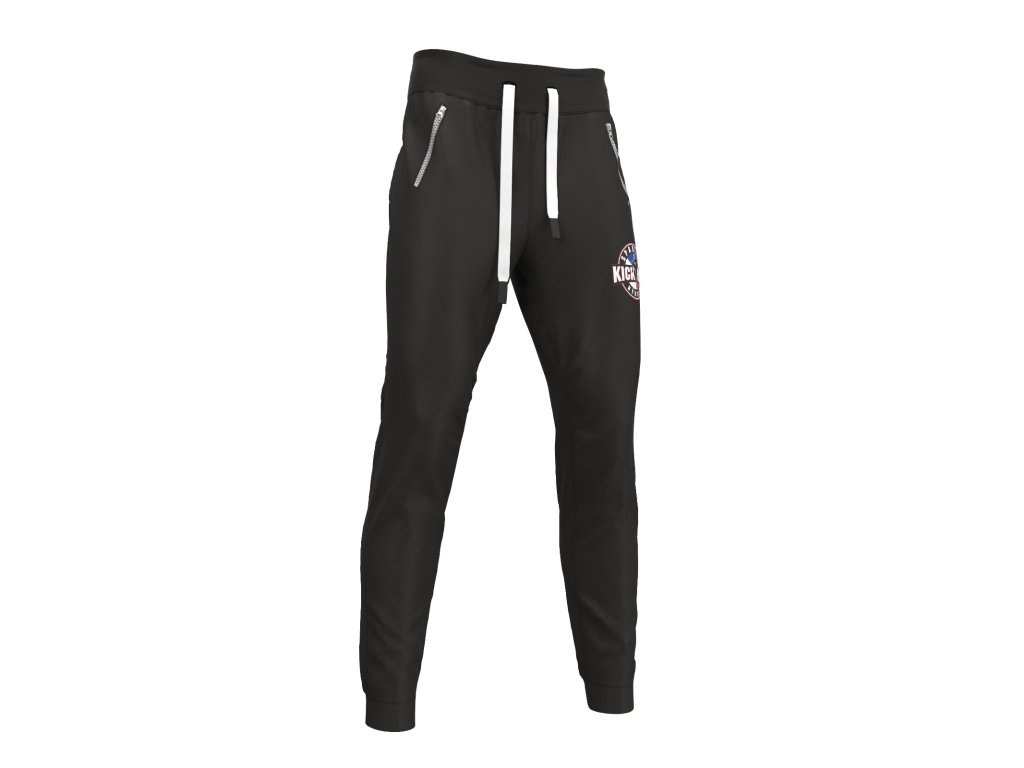 Sportovní tepláky,  které mají dvě boční kapsy na zip.